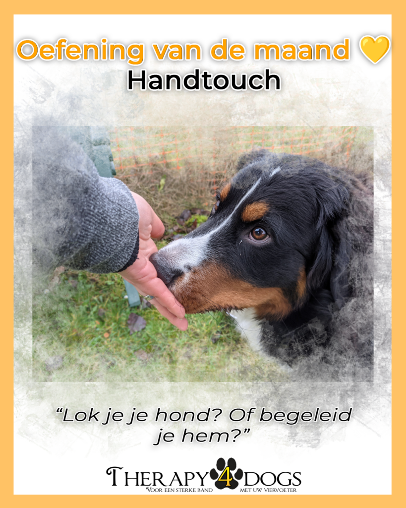 Tijdens mijn lessen gehoorzaamheid leer ik de cursisten ook de handtouch aan met het commando “touch” (of een ander commando als je dat wil).